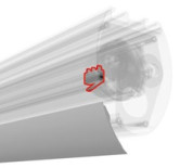 Ook heeft dit scherm een zeer stil oprolsysteem, (zie foto 3) welke gebruik maakt van een dubbele kop met rubbere bussen die de trillingen absorberen tussen de roller en de behuizing. Dat verlaagt het schermgeluid wat wel zo prettig is in een huiselijke omgeving.