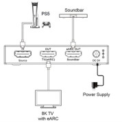 Het is compatibel met UHDTV 8K@60Hz-signalen en biedt EDID-beheer, kabelegalisatie en CEC-bediening van de tv naar de bron en de soundbar.
